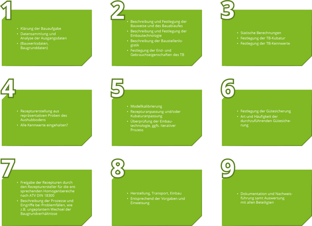 - Ermittlung des Baugrund- und Baurisikos aus dem Baugrundgutachten• Ermittlung der für das jeweilige Bauvorhaben geforderten Parameter für die End- und Gebrauchseigenschaften (z.B.: Tragfähigkeit (dynamische, statische Lasten), Schadstoffimmobilisierung, Setzungsverhalten, Wasserdurchlässigkeiten, Wärme- und elektrische Leitfähigkeiten, schwingungsdämpfende Eigenschaften, etc.)